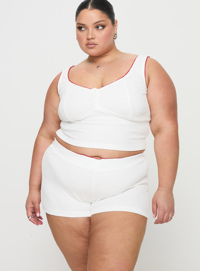 - Contrast detail, lace trim, button at bust, fixed straps, elasticated waistband, lace trim, high-rise fit
