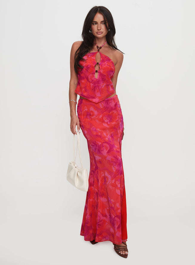 - Halter top, cut-out at front, adjustable halter straps, low back design, maxi skirt bottoms, invisible zipper on side, mid-rise fit
