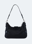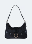 Black shoulder bag Removable shoulder strap Zip and magnetic button fastening  Silver-toned hardware Internal zip pocket and card slip Flat base