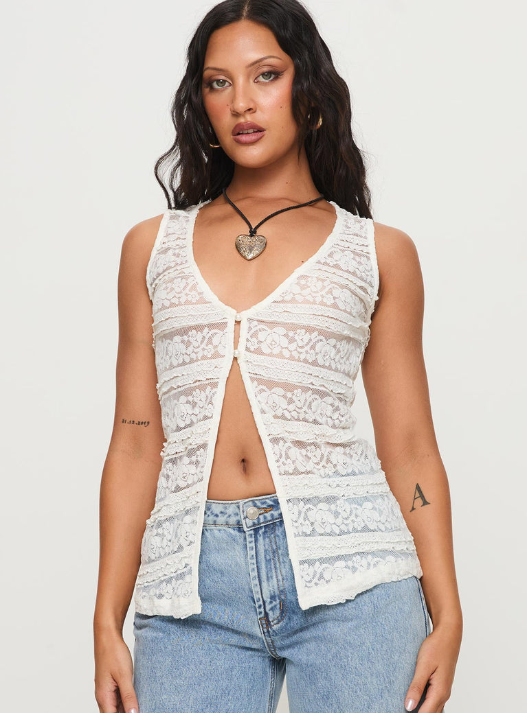 - Plunge neck, double button closure, split hem, sleeveless, sheer
