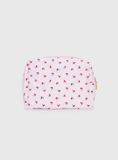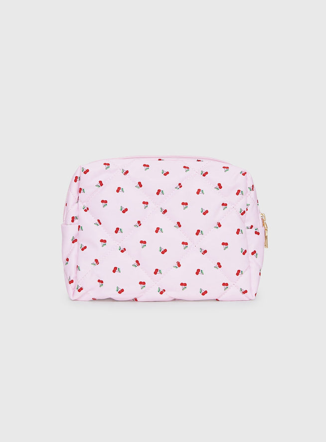 - Cherry design, zip fastening, gold-toned hardware, one main component with internal pockets, exposed stitching detail