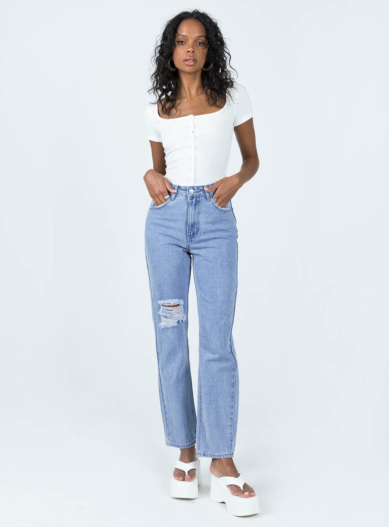 Jeans Mid wash denim Belt looped waist Classic five-pocket design Zip & button fastening High waisted Ripped knee
