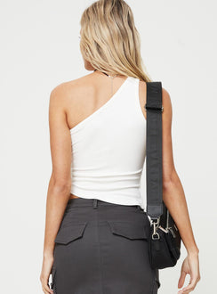 - Slim fitting, one shoulder design, ruching at side, asymmetric hem