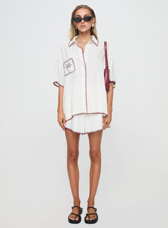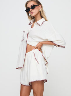 - Button-up top, collared, drop shoulders, high-rise shorts, elasticated waistband, soft pleats waist detail, three-pocket design