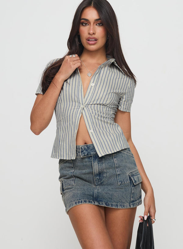 - Shirt style, stripe print, classic collar, button-down closure, cap shoulders