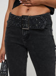 - Black washed, belt looped waist, button & zip closure, five pockets, branded patch at back
