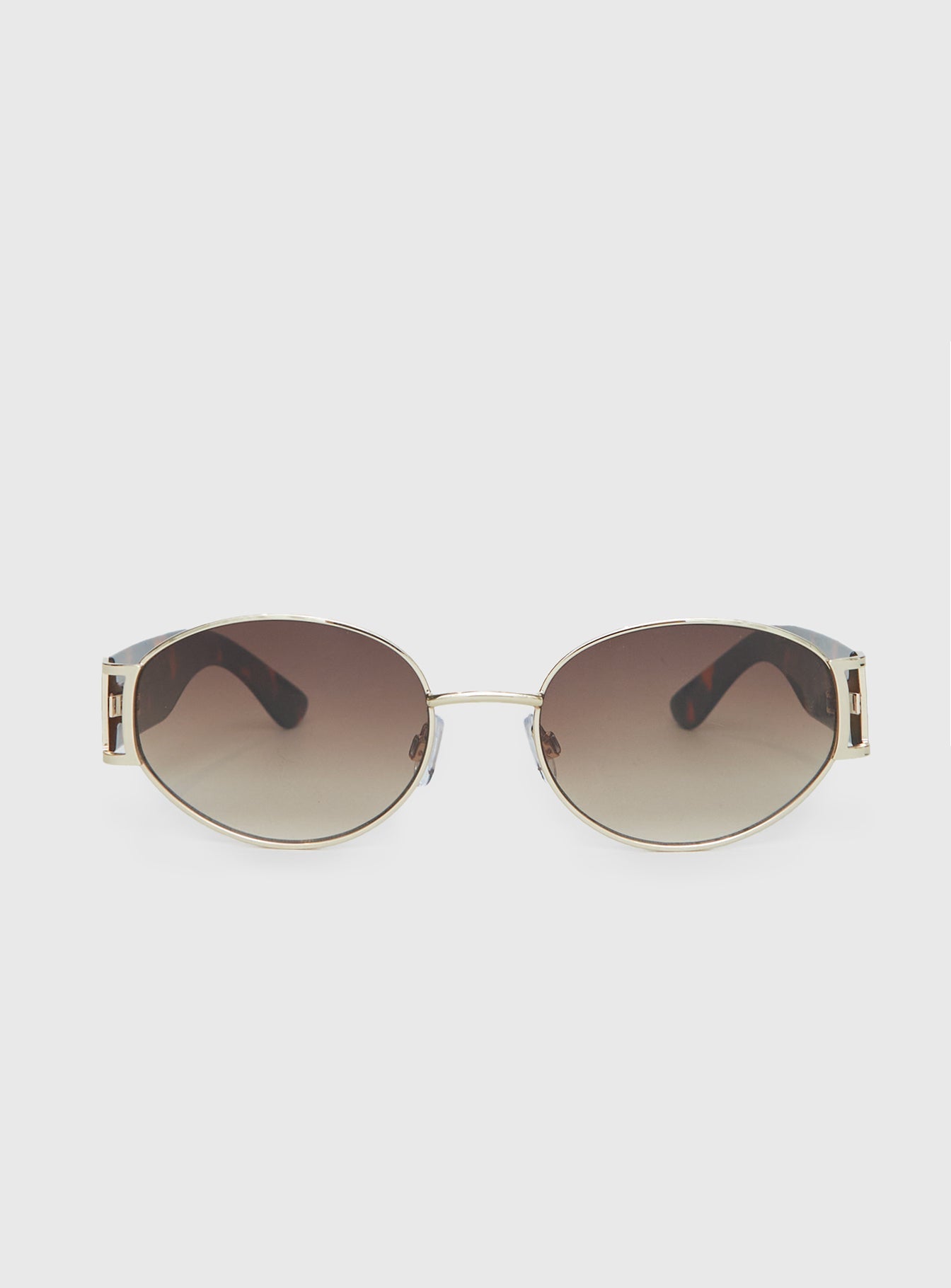 - Brown-tinted lenses, gold-toned metal frames, round-shaped, adjustable nose silicon pads, thick arms
