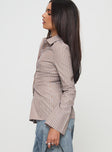 - Stripe print, classic collar, button-down closure, long sleeve, drop shoulders, flare cuffs