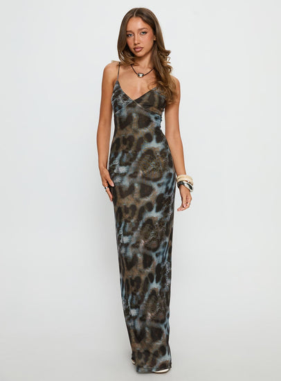 - Maxi dress in leopard print with a v-neckline