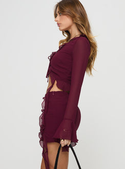 - Long sleeve style, v-neckline, frill detail, tie fastening, split hem