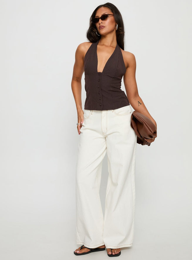 - Plunge neckline, button closure, adjustable halter straps, low back