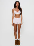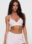 - Cross-over v-neck, lace trim, heart print, bow detail, elasticated band under bust, thin adjustable straps