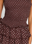- Polka-dot print, inner silicon strip at bust, slim fit, tiered hem