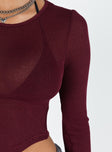 back view of model wearing Princess Polly Sydelle Long Sleeve Top Maroon Full Sleeves Crew Neck
