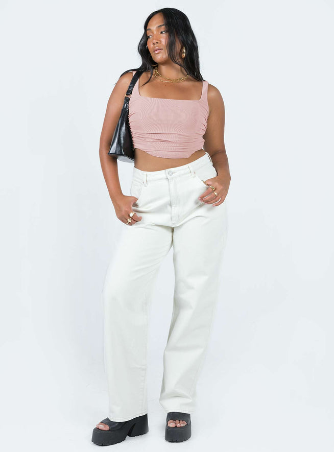 Crop top Mesh material Ruched sides Boning through front Curved hem