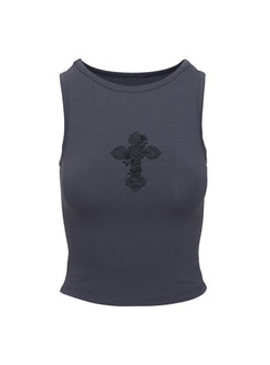 side view of model wearing Princess Polly Thelonius Top Blue Sleeveless Crew Neck