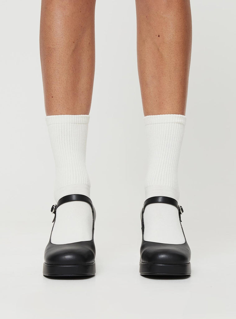 Faux leather loafer heels Single strap upper, silver-toned hardware, block heel, platform base, rounded toe