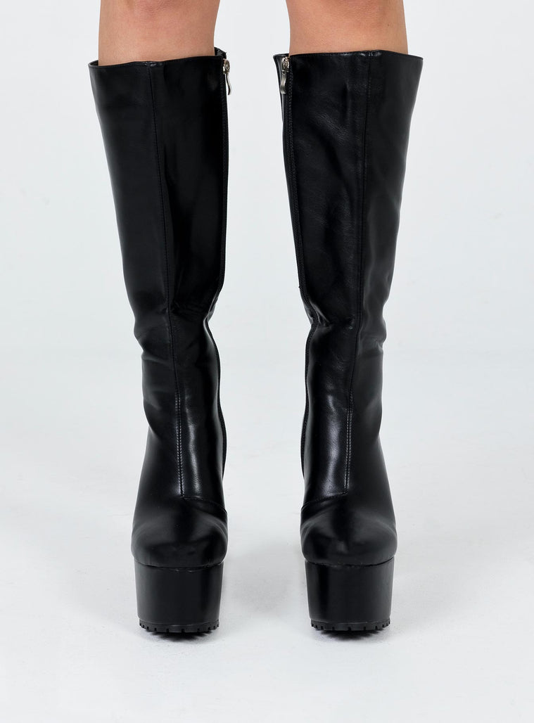 Platform boots Princess Polly Exclusive Faux leather material Knee high Zip fastening at side Block heel Rounded toe Treaded sole