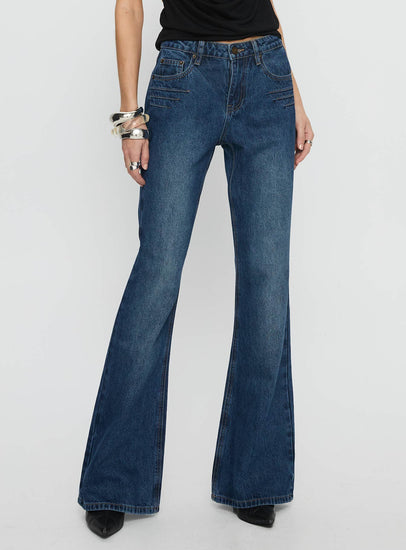 - Belt looped waist, button & zip closure, five pocket, faux pleat detail, flared hem, branded patch at back