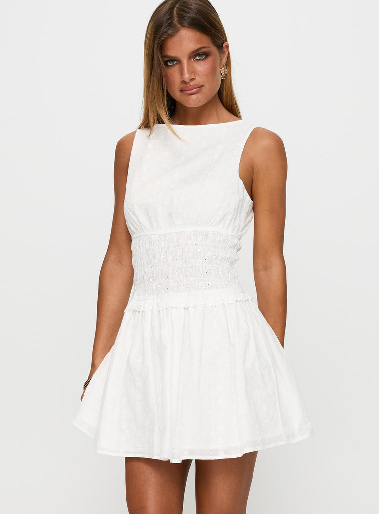 - Floral detail, high neckline, pleated hem, split at back with tie fastening