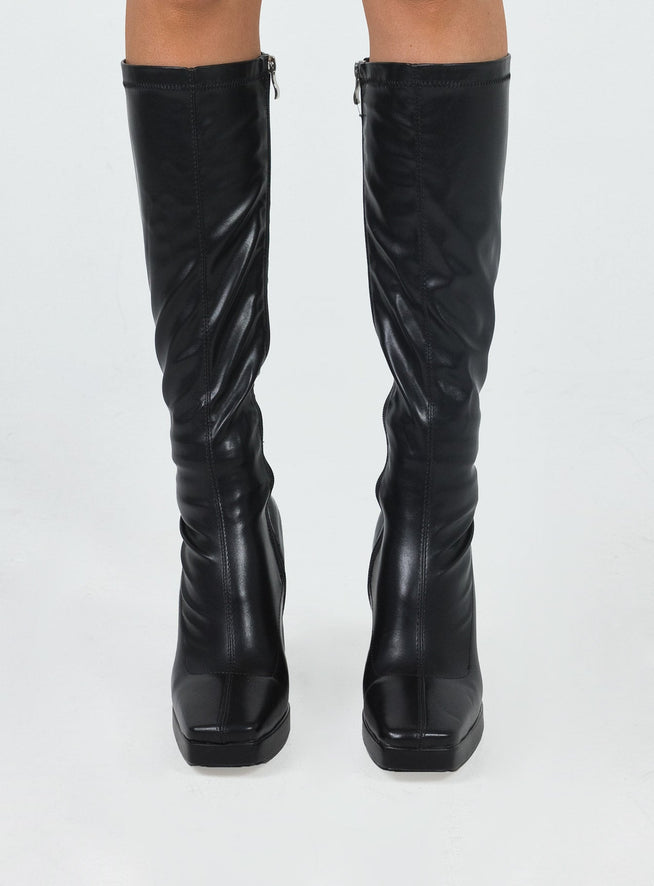 Knee-high boots Faux leather material Square toe Platform base Block heel Zip fastening at side Padded footbed